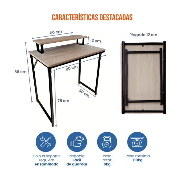 El espesor plegado es de 10.5 cm y la altura armado es de 75 cm desde el piso.